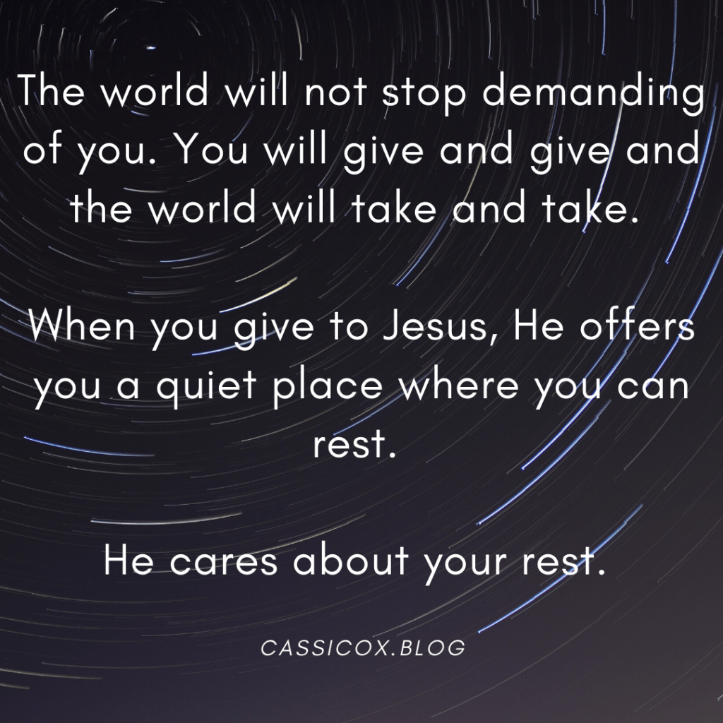 The world will not stop demanding of you. You will give and give and the world will take and take. Mark 6:30-31 tells me that when I give and give to Jesus, He looks out for me. He longs to take me to a quiet place where I can rest.”