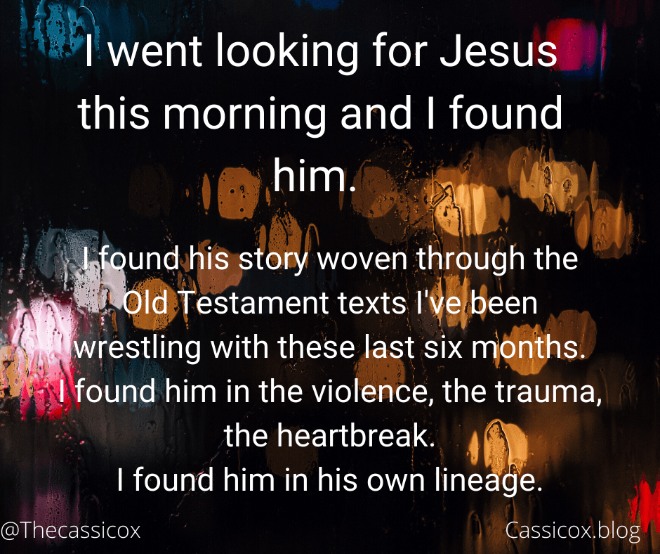 I went looking for Jesus this morning and I found him. I found his story woven through the Old Testament texts I’ve been wrestling with these last six months. I found him in the violence, the trauma, the heartbreak. I found him in his own lineage.
