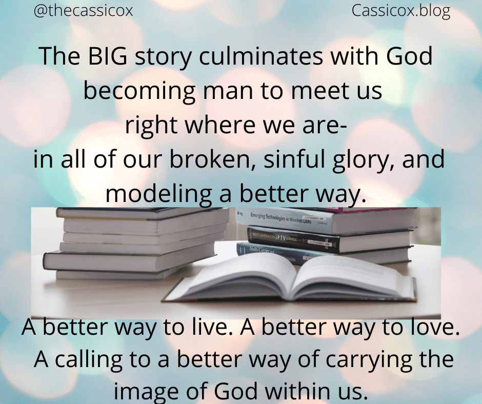 The BIG story culminates with God becoming man to meet us right where we are- in all of our broken, sinful glory, and modeling a better way.